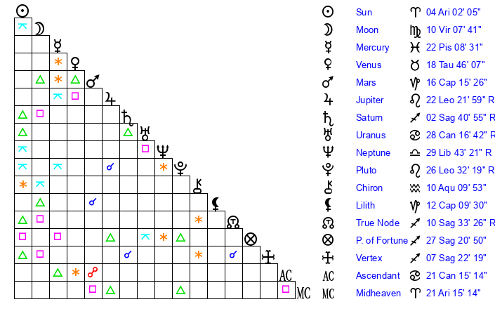 | Sun | 4 Aries 2 | 4 Aries 18 | 11 Gemini 8 |