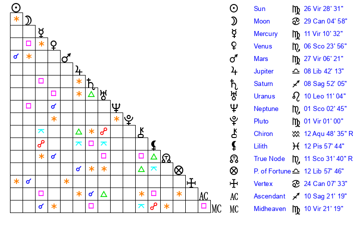 | Sun | 26 Virgo 28 | 27 Virgo 0 | 4 Sagittarius 11 |