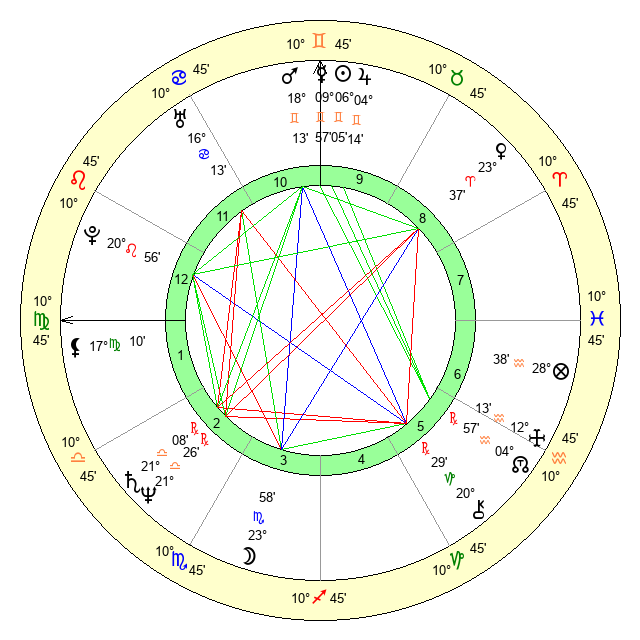 | Moon | 24 Scorpio 0 | 14 Gemini 53 | 22 Cancer 28 |
