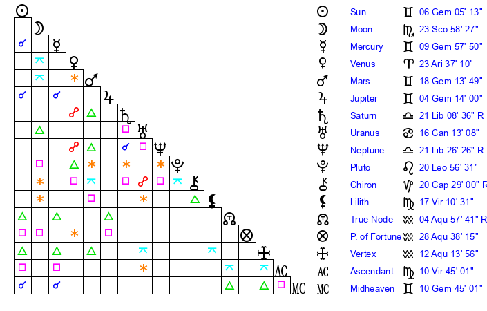 | Moon | 24 Scorpio 0 | 14 Gemini 53 | 22 Cancer 28 |