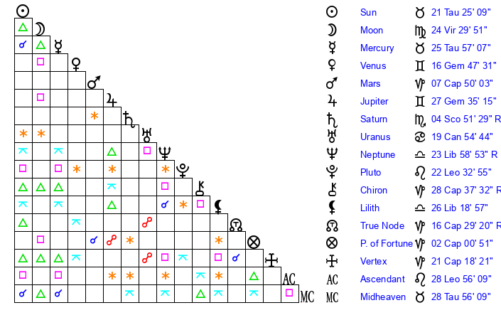 | Moon | 24 Virgo 28 | 22 Scorpio 14 | 25 Aries 13 |