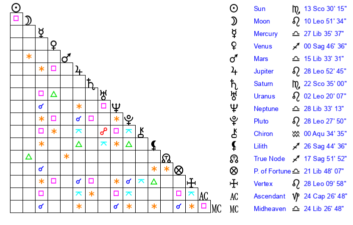 | Sun | 13 Scorpio 30 | 14 Scorpio 32 | 24 Capricorn 32 |