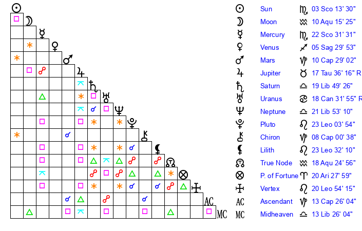 | Sun | 3 Scorpio 13 | 3 Scorpio 32 | 17 Capricorn 7 |