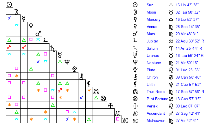 | Neptune | 21 Virgo 50 | 0 Aries 16 | 23 Virgo 18 |