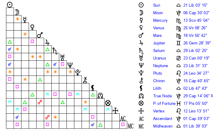 | Sun | 21 Libra 3 | 21 Libra 36 | 3 Capricorn 37 |