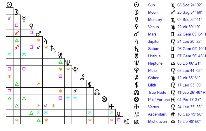 | Sun | 8 Scorpio 24 | 9 Scorpio 31 | 1 Aquarius 34 |