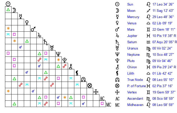 | Moon | 11 Sagittarius 8 | 5 Pisces 50 | 7 Aries 13 |