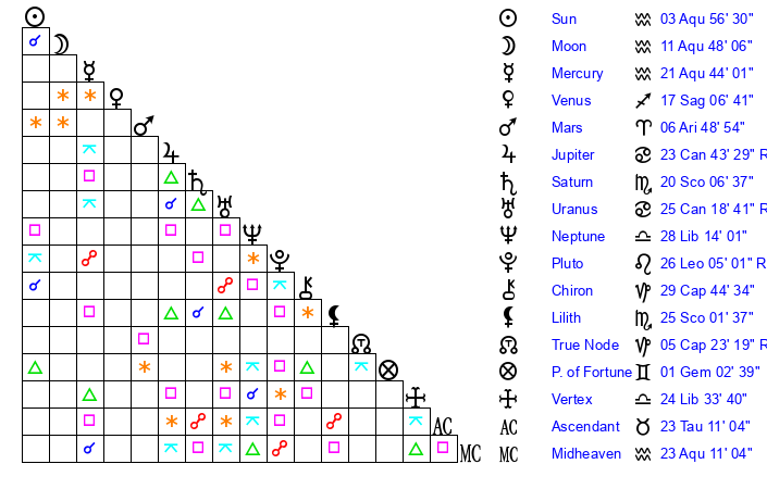 | Moon | 11 Aquarius 51 | 6 Sagittarius 16 | 14 Virgo 14 |