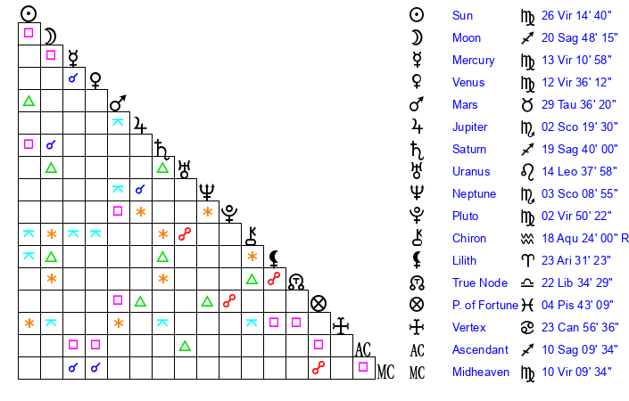 | Sun | 26 Virgo 14 | 27 Virgo 0 | 2 Sagittarius 55 |