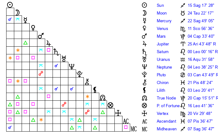 | Venus | 11 Scorpio 56 | 8 Sagittarius 38 | 27 Pisces 34 |