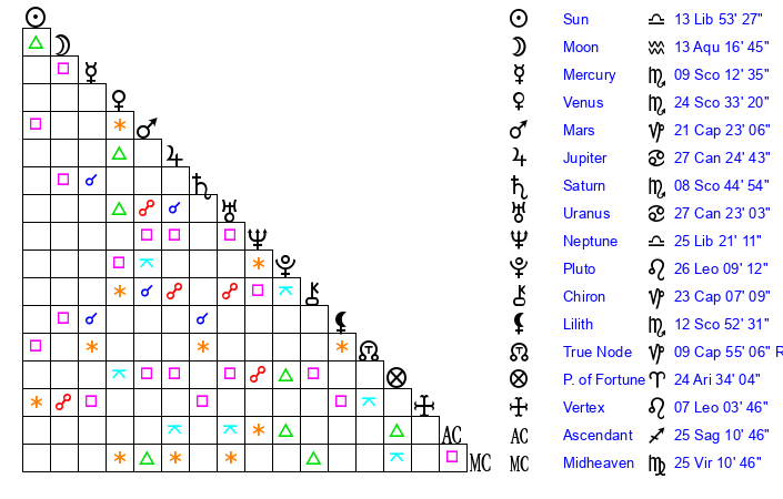 | Neptune | 25 Libra 21 | 0 Aries 21 | 27 Libra 43 |