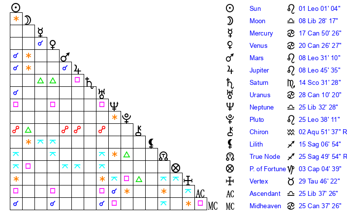 | Moon | 8 Libra 40 | 0 Leo 46 | 20 Aries 27 |