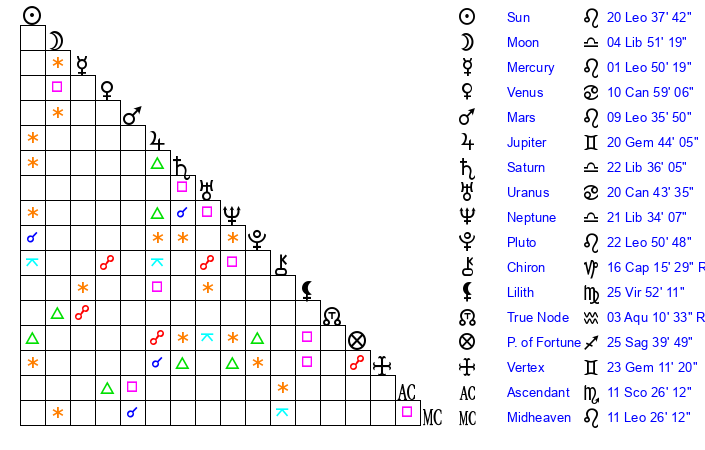| Sun | 20 Leo 37 | 21 Leo 12 | 0 Scorpio 59 |