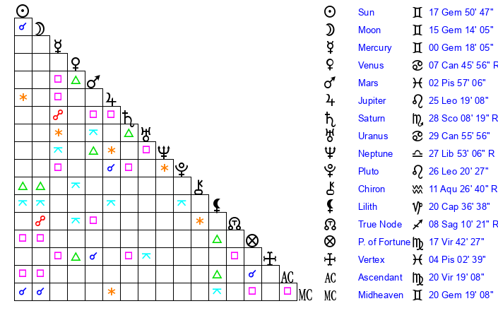 | Moon | 15 Gemini 14 | 19 Scorpio 2 | 1 Capricorn 9 |