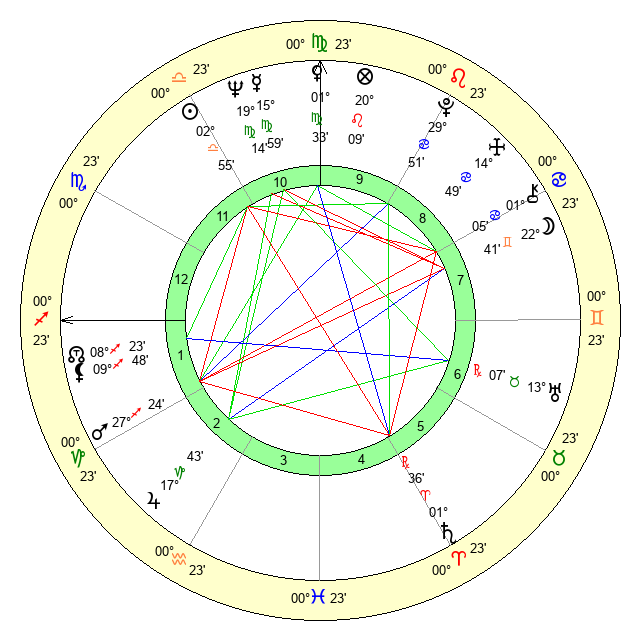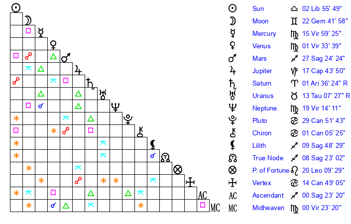 Moon | 22 Gemini 31 | 24 Scorpio 49 | 17 Virgo 31 |