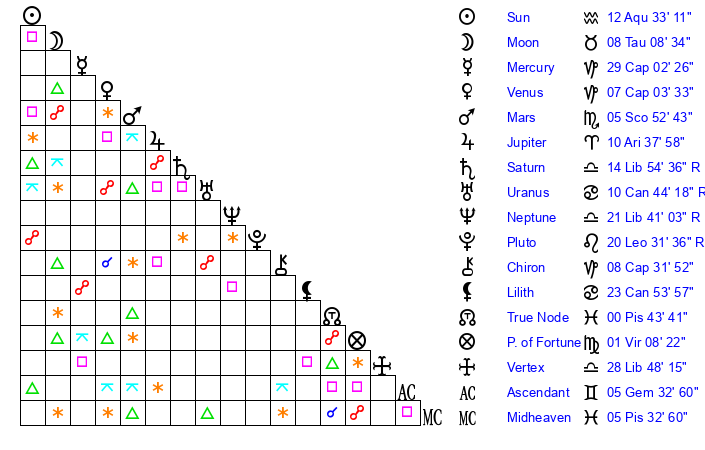 | Neptune | 21 Libra 41 | 28 Pisces 0 | 20 Libra 12 |