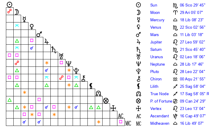 | Neptune | 28 Libra 18 | 29 Pisces 48 | 0 Scorpio 15 |