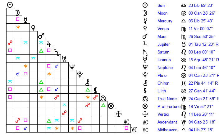 | Moon | 9 Cancer 34 | 11 Virgo 53 | 7 Cancer 9 |