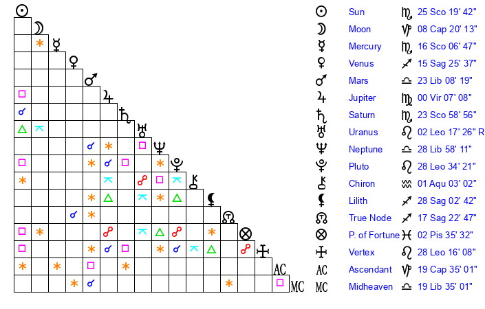 | Sun | 25 Scorpio 19 | 26 Scorpio 21 | 6 Aquarius 29 |