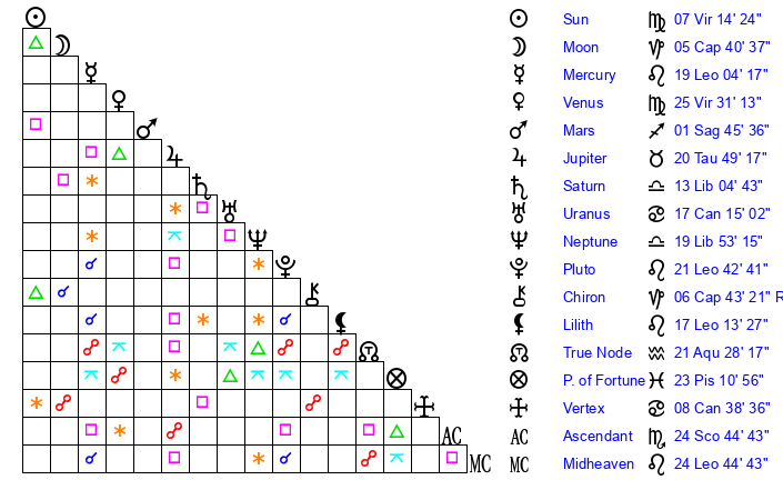| Mercury | 19 Leo 4 | 24 Leo 39 | 12 Sagittarius 0 |