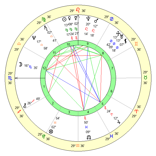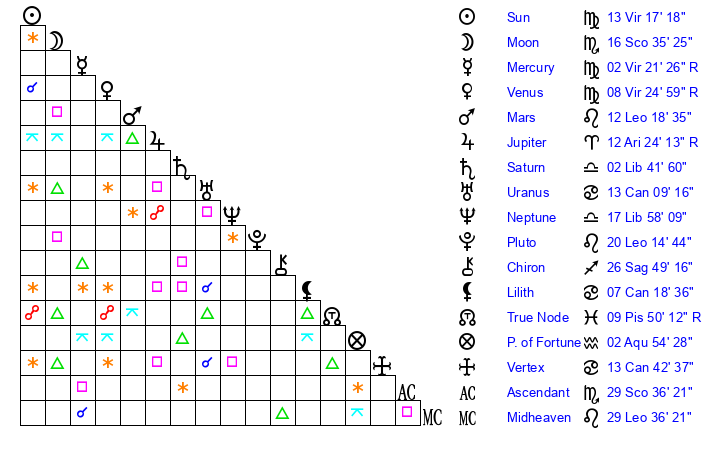 | Sun | 13 Virgo 17 | 14 Virgo 21 | 26 Scorpio 33 |