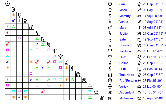 | Moon | 9 Sagittarius 50 | 6 Libra 37 | 7 Cancer 34 |