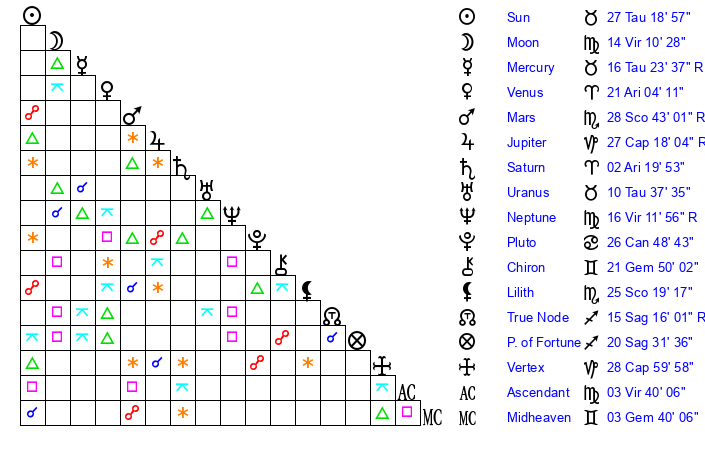 | Moon | 14 Virgo 16 | 6 Aquarius 4 | 28 Scorpio 9 |