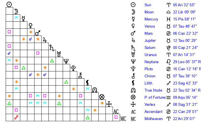 | Moon | 22 Libra 3 | 28 Aquarius 29 | 14 Aries 55 |