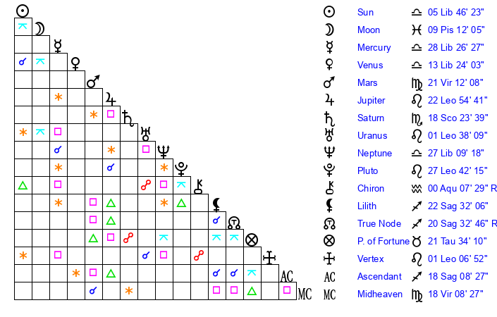 | Saturn | 18 Scorpio 51 | 27 Pisces 44 | 26 Scorpio 48 |