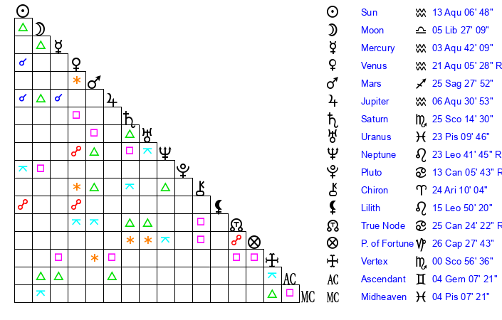 | Sun | 13 Aquarius 7 | 14 Aquarius 6 | 21 Taurus 12 |