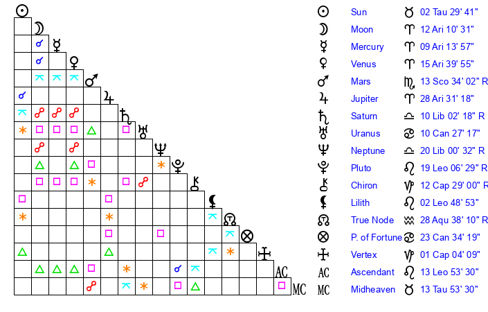 | Moon | 12 Aries 9 | 22 Aquarius 59 | 3 Sagittarius 47 |