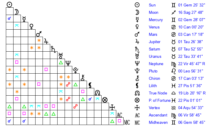 | Sun | 1 Gemini 25 | 1 Gemini 51 | 22 Leo 41 |