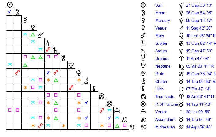| Moon | 26 Capricorn 49 | 24 Virgo 40 | 25 Gemini 50 |