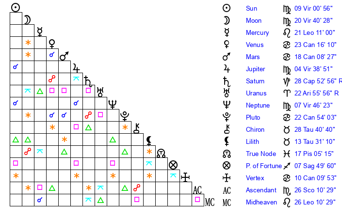| Moon | 20 Virgo 39 | 25 Sagittarius 29 | 27 Aquarius 13 |