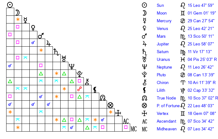 | Venus | 25 Leo 43 | 9 Cancer 56 | 4 Capricorn 51 |