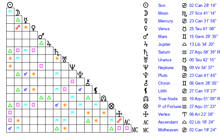 | Moon | 27 Scorpio 37 | 23 Gemini 25 | 7 Aries 7 |