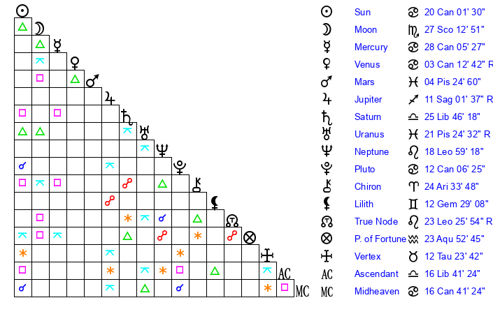 | Moon | 27 Scorpio 14 | 12 Aquarius 59 | 6 Leo 21 |