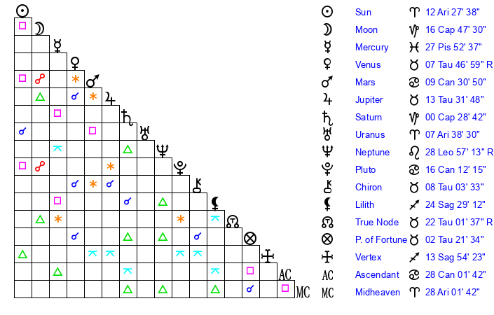 | Moon | 16 Capricorn 34 | 12 Gemini 27 | 27 Cancer 6 |
