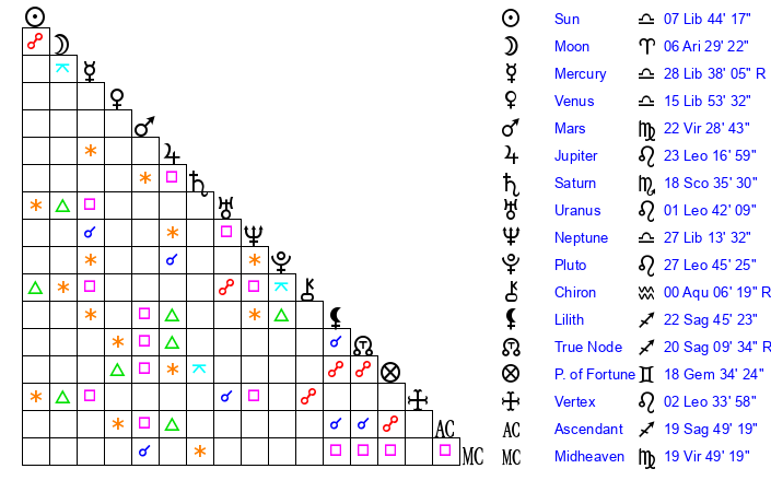 | Mars | 22 Virgo 29 | 6 Scorpio 21 | 7 Scorpio 34 |