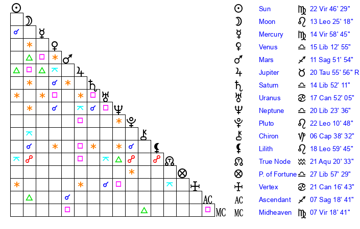 | Sun | 22 Virgo 46 | 23 Virgo 6 | 5 Sagittarius 24 |
