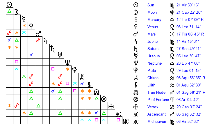 | Sun | 21 Virgo 50 | 22 Virgo 8 | 0 Sagittarius 23 |