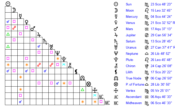 | Saturn | 13 Scorpio 56 | 25 Pisces 10 | 20 Scorpio 41 |