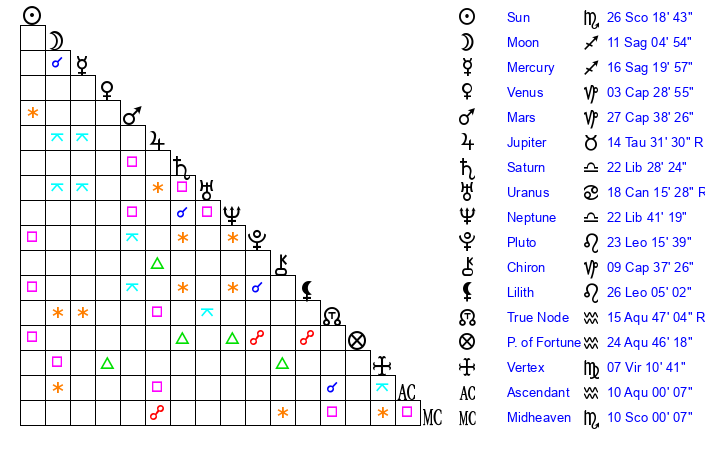 | Sun | 26 Scorpio 19 | 26 Scorpio 36 | 10 Aquarius 32 |