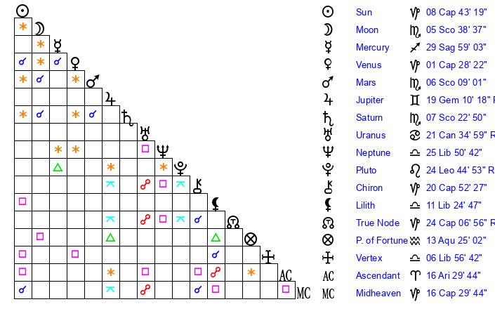 | Saturn | 7 Scorpio 51 | 26 Pisces 0 | 9 Scorpio 25 |