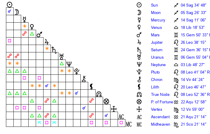 | Moon | 5 Sagittarius 22 | 28 Aquarius 44 | 2 Sagittarius 31 |