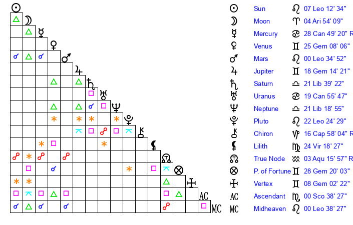 | Sun | 7 Leo 12 | 7 Leo 47 | 17 Libra 5 |