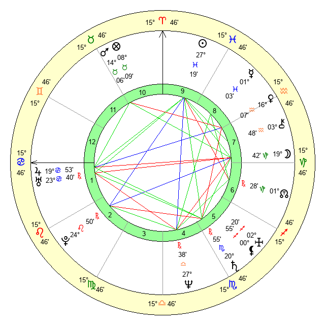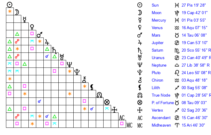 | Saturn | 21 Scorpio 25 | 22 Pisces 47 | 17 Scorpio 4 |