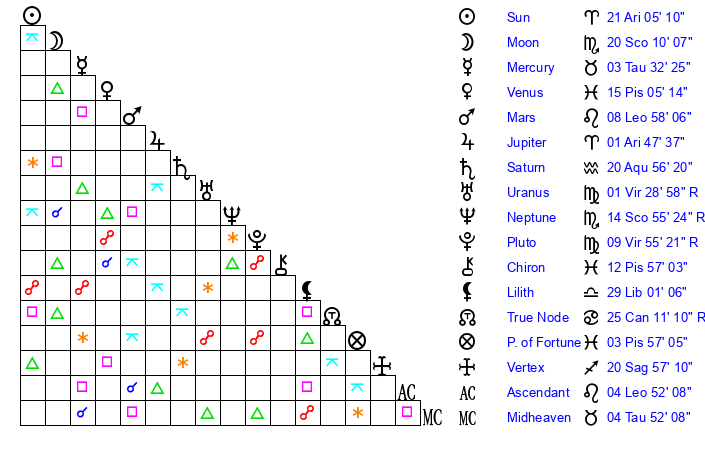 | Neptune | 14 Scorpio 54 | 0 Aries 27 | 13 Scorpio 20 |