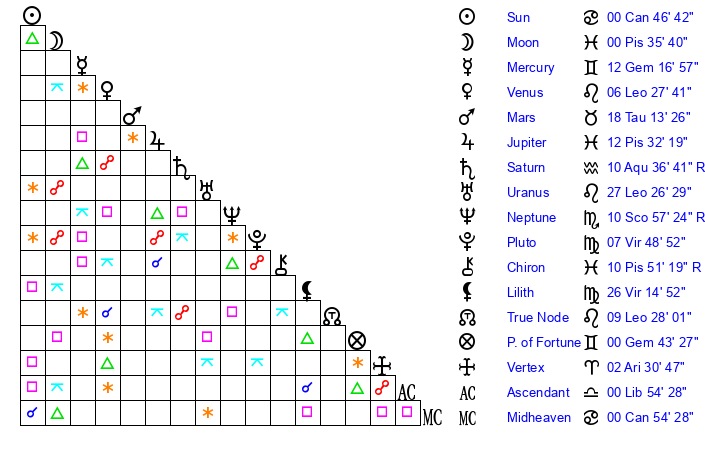 | Jupiter | 12 Pisces 21 | 2 Cancer 56 | 8 Pisces 23 |