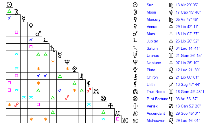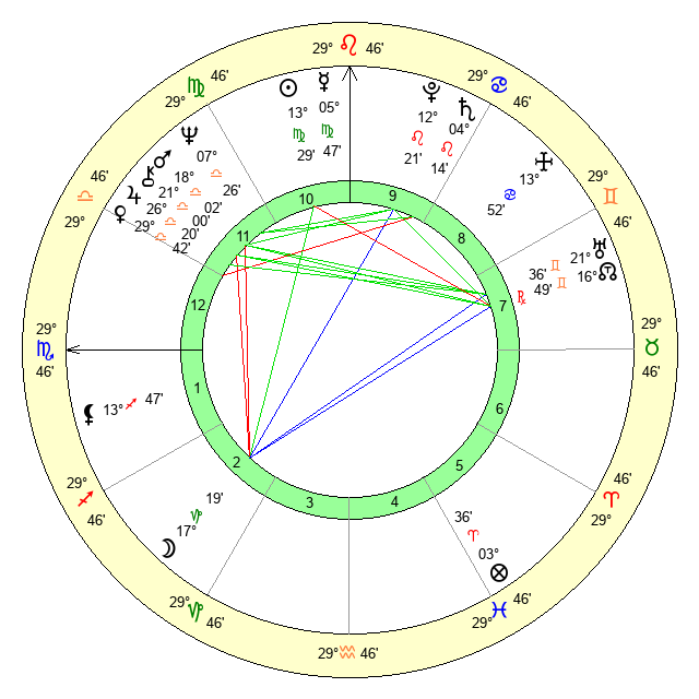 | Venus | 29 Libra 42 | 14 Leo 26 | 20 Scorpio 50 |